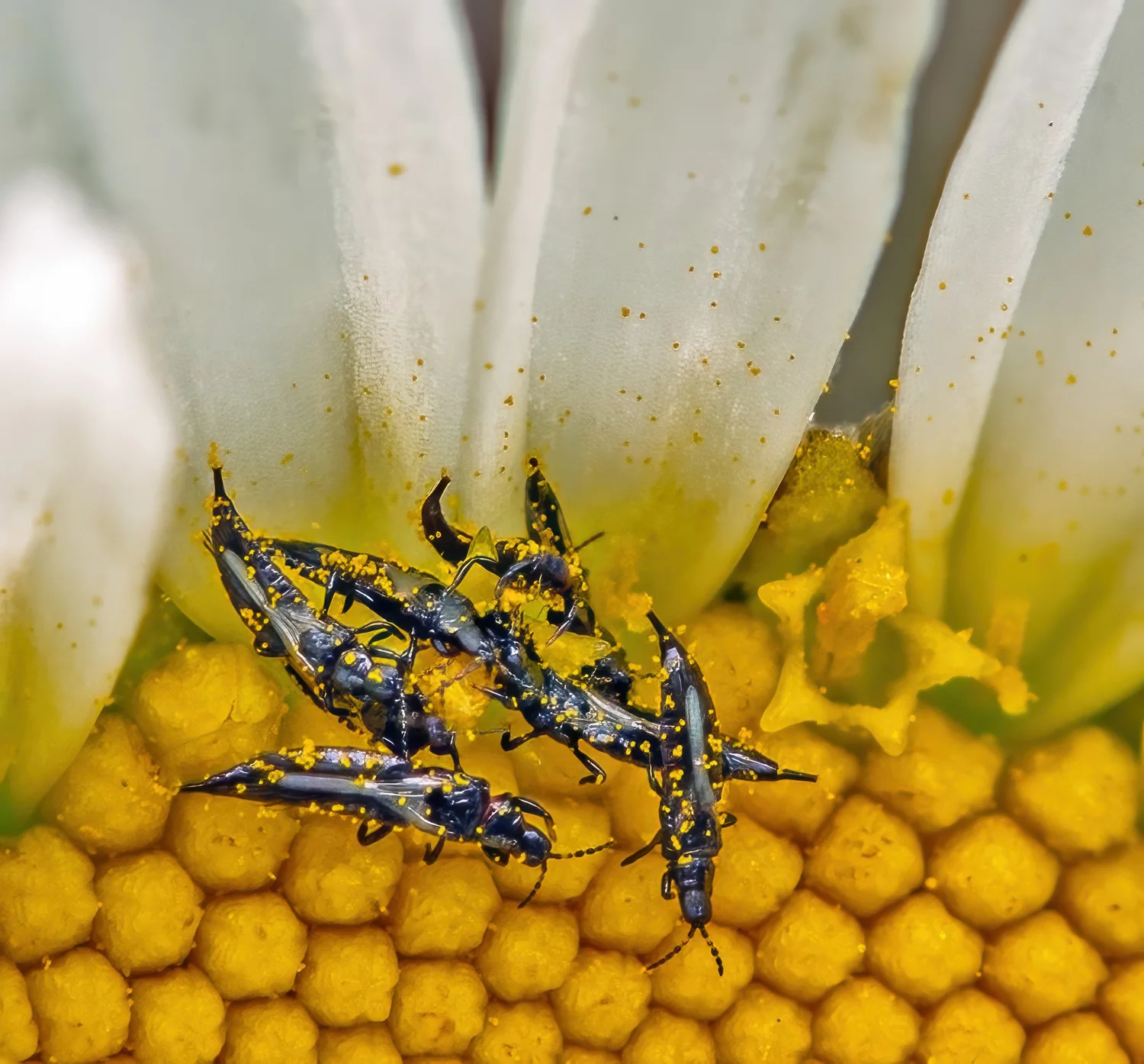 The name of this order is from the Greek “thysanos” meaning fringe and “ptera” meaning wings. An interesting “fringe” is on each wing. Thrips can be found on flowers, leaf litter, and fungi all over the world. Gardeners and farmers consider thrips destructive pests of plants, grains, fruits, and vegetables; however, some thrips are beneficial since they can control mites and other invasive small insects. I would have not known about the existence of these insects unless I looked closely at some daisies in a field that had dark specks in the center. Usually one may just assume they are bits of dust or dirt debris, and I am sure I have “seen” them my whole life but didn’t know what I was looking at. We are fortunate to have the technology to see the small natural world that otherwise remains invisible and misunderstood.